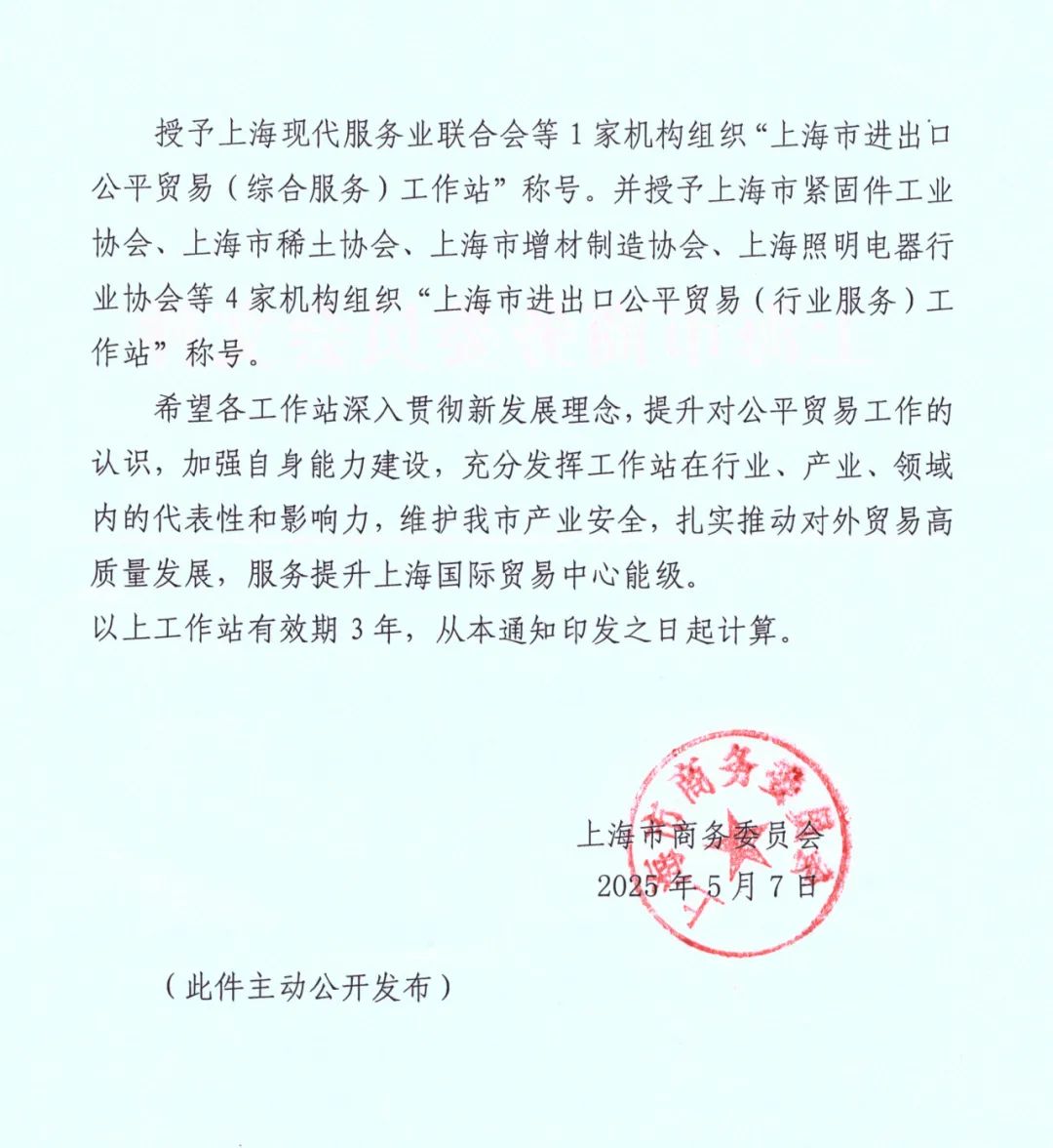 近日,上海市商务委正式授予上海照明电器行业协会“上海市进出口公平贸易(行业服务)工作站”称号!这是对我协会在服务行业、维护企业权益、推动国际化发展的高度认可,更是上海照明产业深化开放、接轨全球的重要助力!