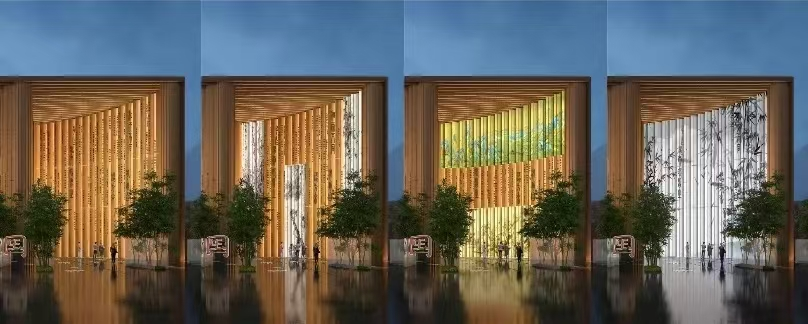 中国馆将竹与钢结构巧妙结合,芯龙光电则通过单、双光学腔体机械调光系统(调光范围达-5°至+15°)与多样化的光学偏光方案,将光均匀渗透至竹简肌理,助力中国馆在建筑设计上与传统文化水乳交融,营造出“天人合一”的绿色发展意境与“人在画中游”的传统美学体验。