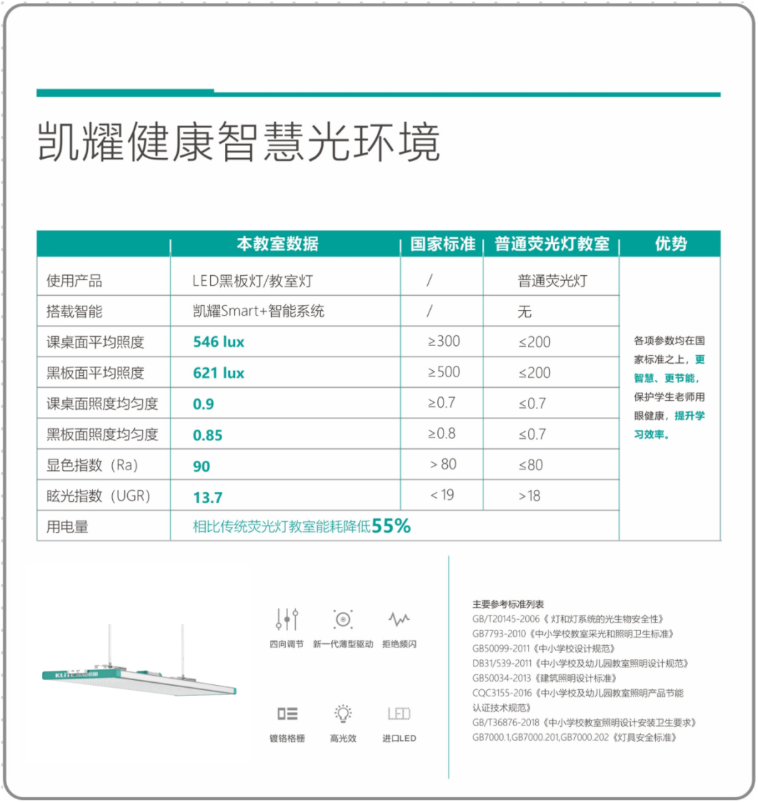凯耀照明教室,只用高品质灯具,采用新一代飞利浦同品质驱动,具有稳定不频闪,超长寿命的特点,更省电更降低能耗,进一步降低维护成本。未来,凯耀照明仍会在照明研发中大力投入,为孩子们提供高性价比和高创新性的灯具产品。